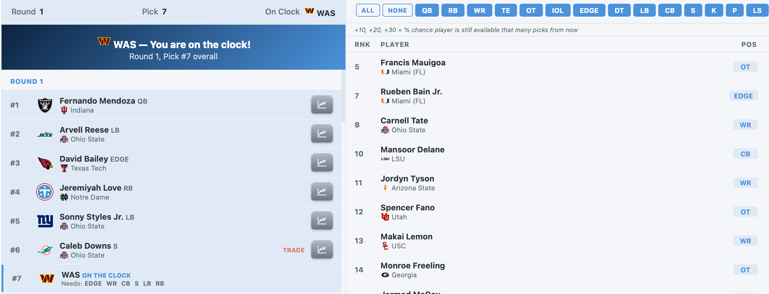 If the board falls this way, the Commanders’ top options would be WR Carnell Tate, CB Mansoor Delane, and EDGE Rueben Bain Jr. Sure, those are still good options, but not nearly as quality as the players picked before them, and they may trade back a few spots if this is how the board falls.