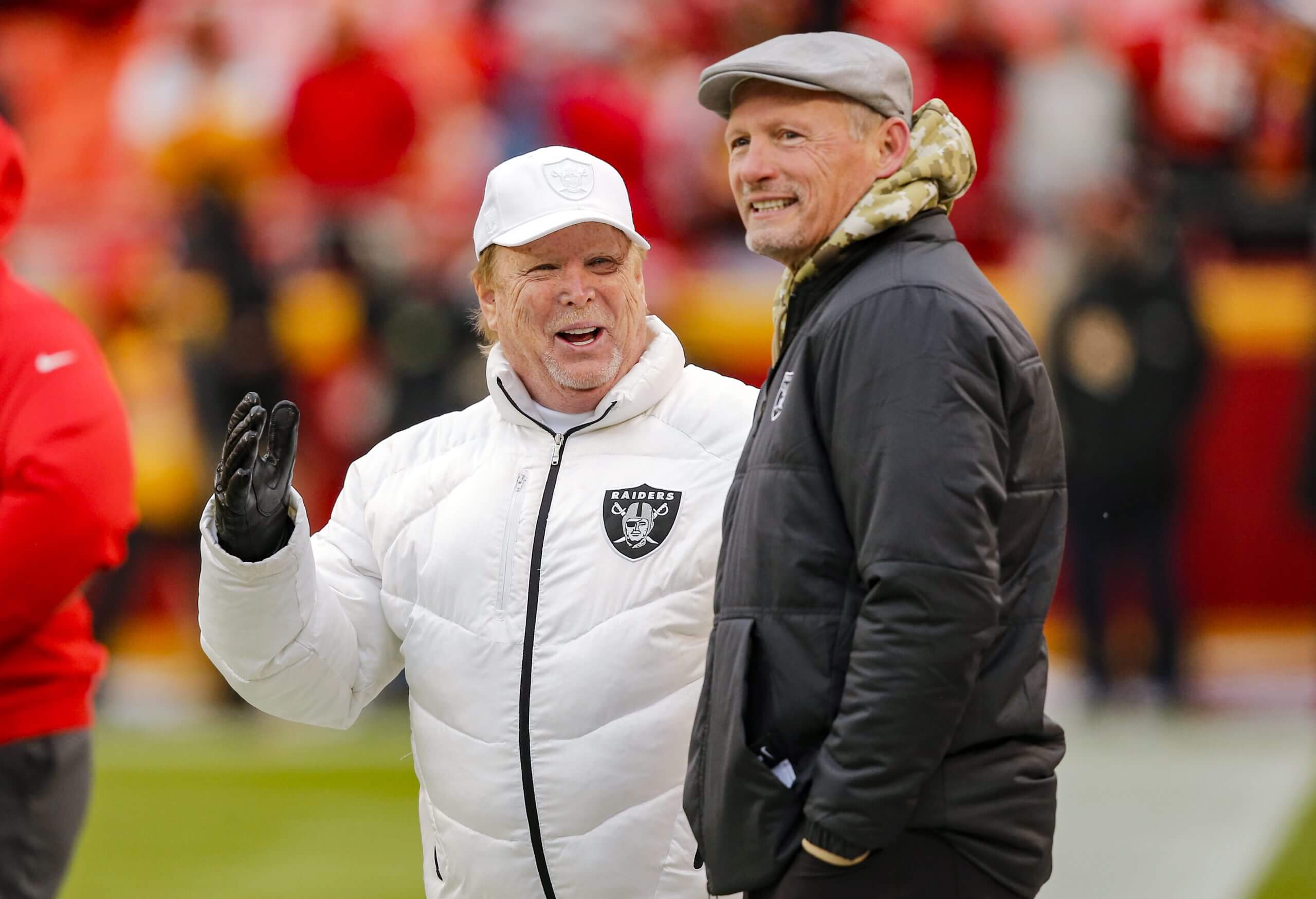 Mark Davis (left) and Mike Mayock were left to pick up the pieces after Gruden resigned in 2021. (David Eulitt / Getty Images)