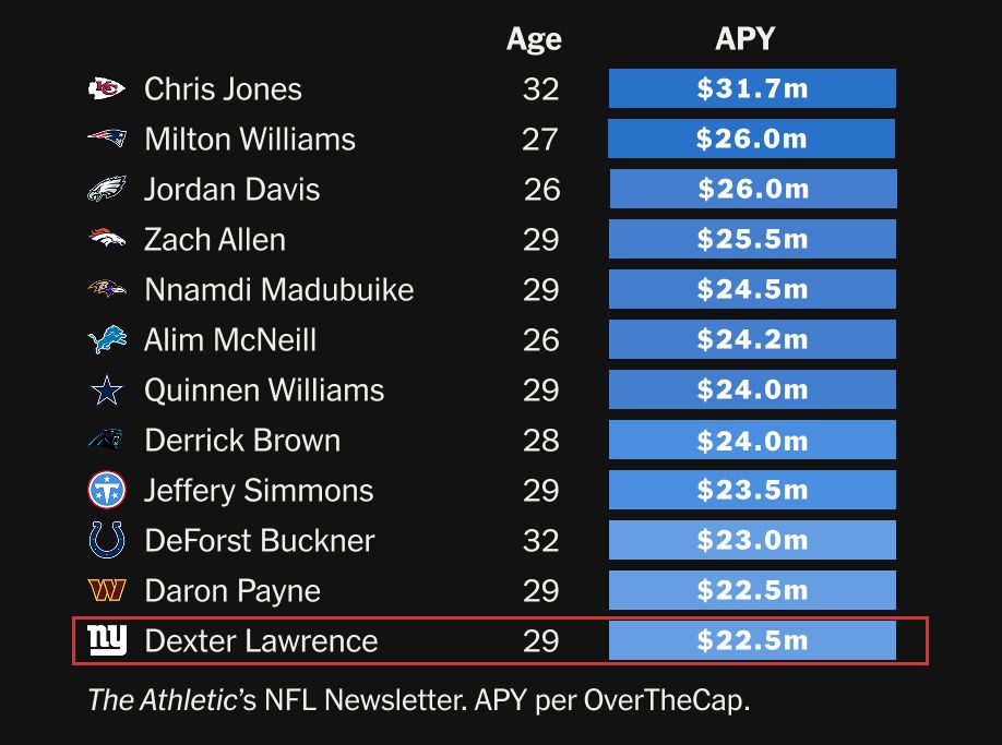 Good news: Keeping him sounds simple. He wants two things: a raise and guarantees. Lawrence has no guaranteed money remaining on the four-year, $90 million deal he signed in 2023. That average per year pay (APY) also ranks 12th among interior linemen.