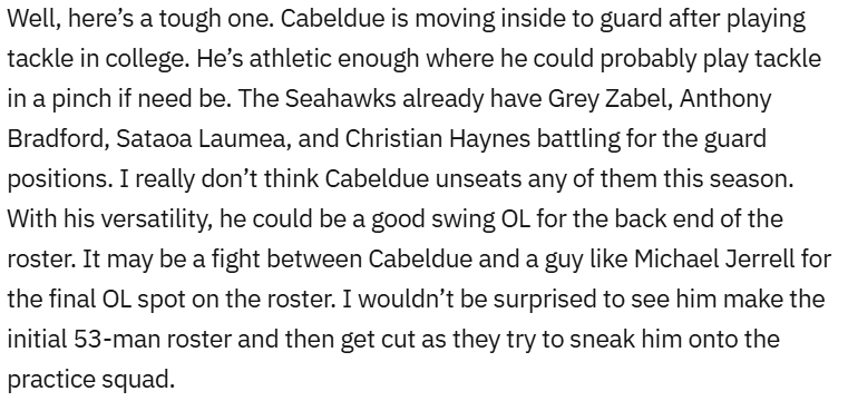 Cabeldue did in fact make the roster as the Seahawks traded away Michael Jerrell. He didn’t play many snaps, only being active for eight games, but the team seems to be high on him. This preseason will be a big chance for Cabeldue to cement his position as a reserve lineman on the roster.
