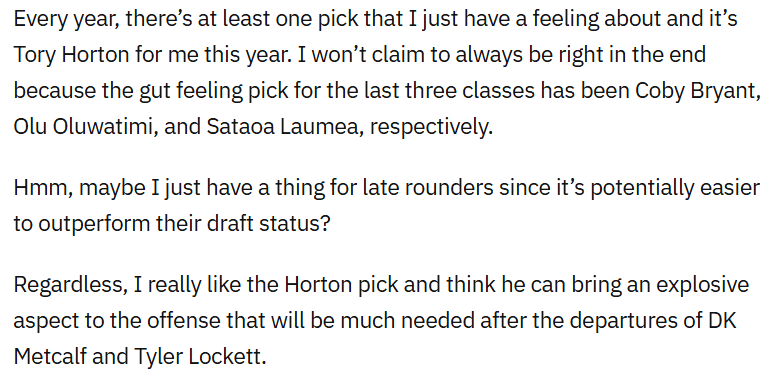 Not that bad of a year for the predictions, if I do say so myself. I won’t pat myself on the back too hard, however, because we’re nearly to the 2026 NFL Draft which will give me another chance to prove myself completely wrong. Seattle has far less picks this season, which could be either a good or bad thing for my predictions…we’ll soon find out!