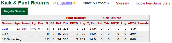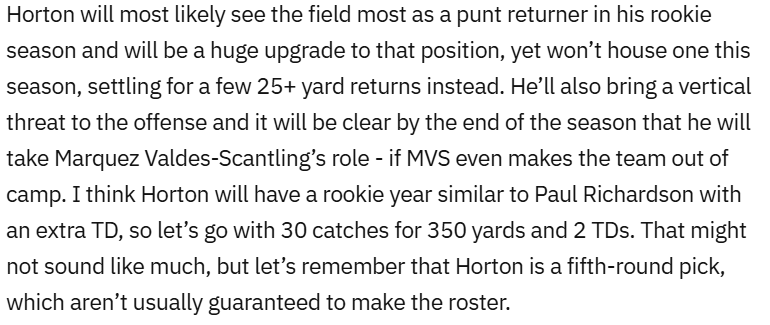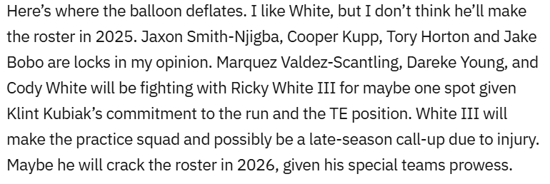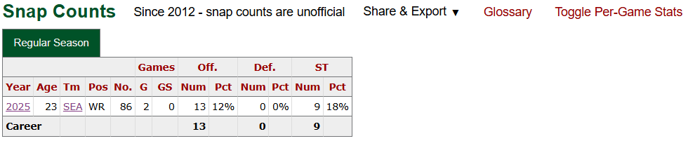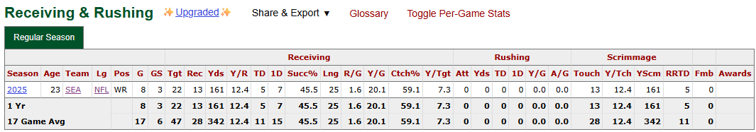 Six total touchdowns in eight games, with two coming in the final one before his season-ending injury? That would be a damn good stat line for a receiver drafted in the first few rounds let alone a fifth-round pick. I think I forgot just how fun Tory Horton was prior to his injury. Issues. Yes, those are scary considering he dealt with them throughout college. However, I’m willing to hope that he’ll be healed up come the 2026 season.