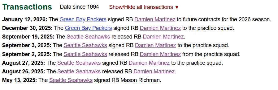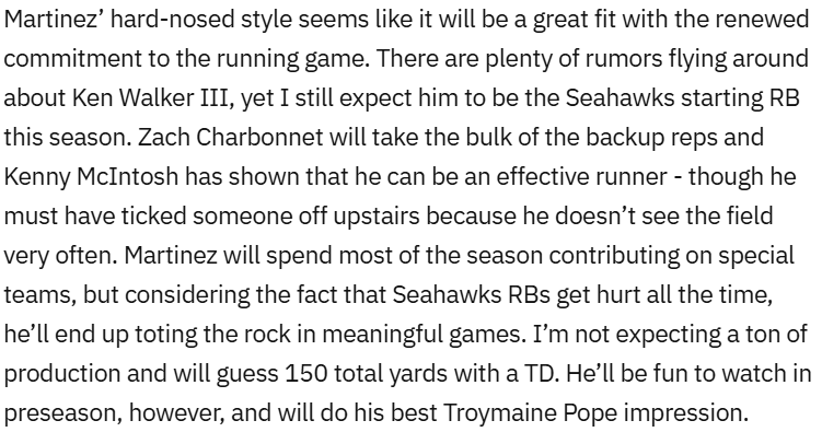 The fact that I’m showing a transactions log is never a good sign. Martinez looked tentative and slow in the preseason, getting outplayed by George Holani and even Jacardia Wright. As a result, he was released and bounced on and off the practice squad. Martinez was signed by the Green Bay Packers towards the end of the season on their practice squad and has a chance to stick with them this offseason. Big miss by me.