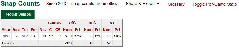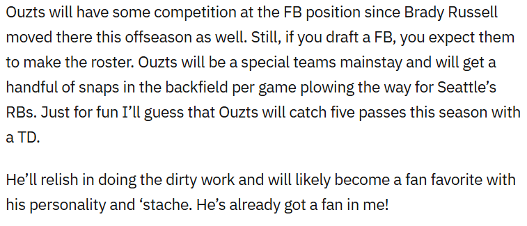 Unfortunately, Ouzts suffered a neck injury late in the season that kept him out a number of games. Seattle started to run the ball well without him on the field, so I hope that doesn’t impact his future. New offensive coordinator Brian Fleury comes from the Shanahan system which utilizes a fullback…hopefully we get to see more pancakes from Ouzts in the future!