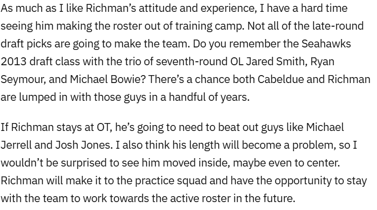 Richman seeing time at center is only going to benefit him. He was listed as a Tackle/Guard when he was inactive for the Super Bowl, but having experience at center will be huge. If Richman can truly learn those three positions, he has a chance to stick around as the ultimate swing offensive lineman for the Seahawks.