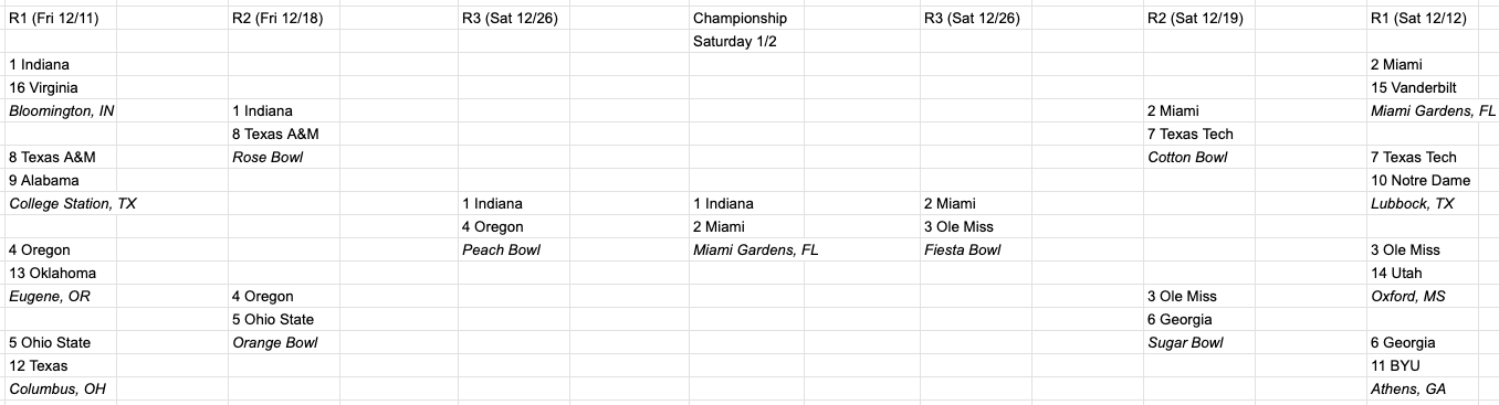 We’ll keep the rest of the structure similar to how it’s done today, with the first round being on-campus games, while the quarterfinals and semifinals will be the New Year’s Six bowls. Here’s what this would’ve looked like in 2025 with the seeding being based on the final AP Poll: