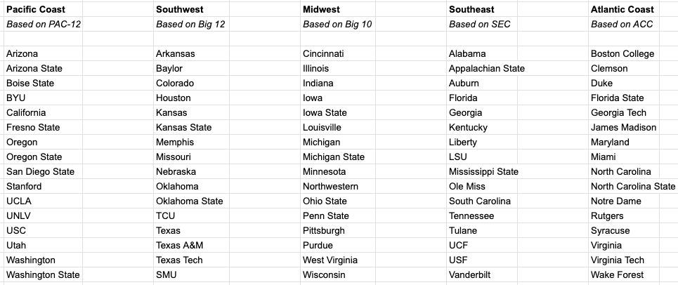 This structure includes all 68 teams that are currently in Power 4 conferences plus 12 additional schools, giving us a total of 80 that can be divided into five conferences with 16 teams each. It keeps geography at the forefront for travel purposes, while also mixing in some of the long-standing relationships between schools.