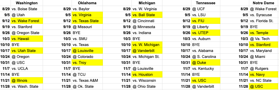 Here’s an example of what a schedule could look like for one school from each conference (Washington, Oklahoma, Michigan, Tennessee, and Notre Dame) based on our stipulations with non-conference matchups highlighted: