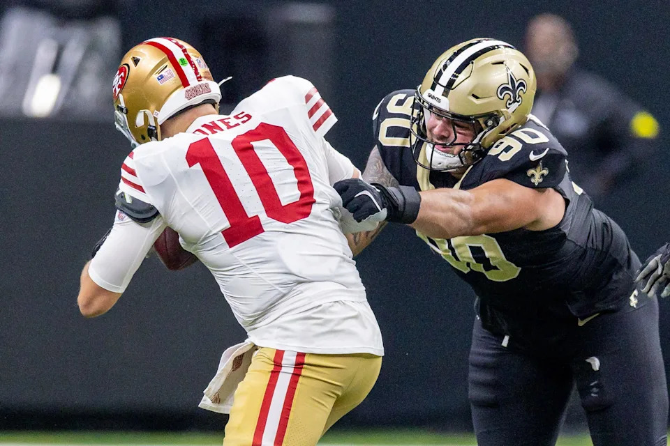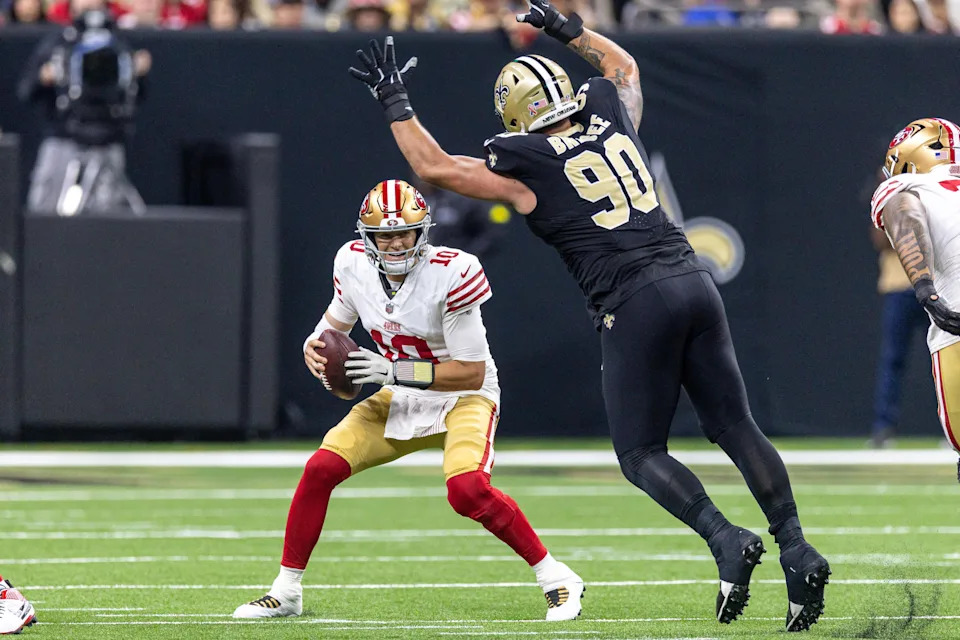 NEW ORLEANS, LOUISIANA – SEPTEMBER 14: Mac Jones #10 of the San Francisco 49ers is wrapped up by Bryan Bresee #90 of the New Orleans Saints during the first quarter in the game at Caesars Superdome on September 14, 2025 in New Orleans, Louisiana. (Photo by Chris Graythen/Getty Images)