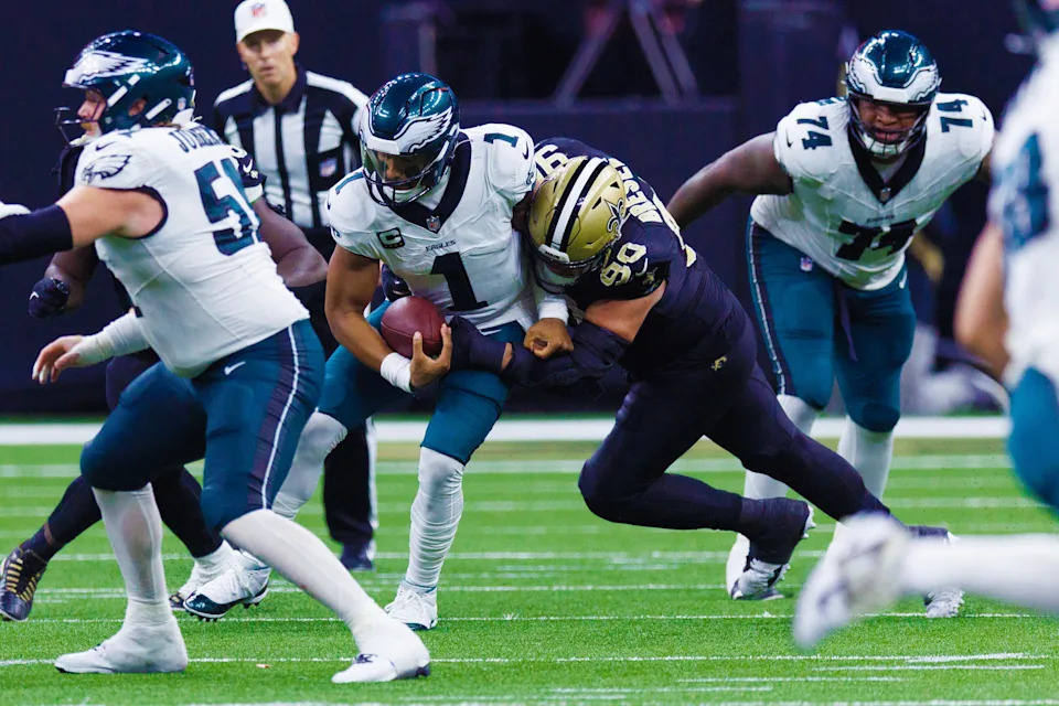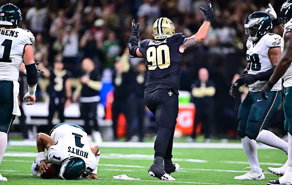 NEW ORLEANS, LOUISIANA – SEPTEMBER 22: Bryan Bresee #90 of the New Orleans Saints celebrates a sack against Quarterback Jalen Hurts #1 of the Philadelphia Eagles during the third quarter at Caesars Superdome on September 22, 2024 in New Orleans, Louisiana. (Photo by Gus Stark/Getty Images)