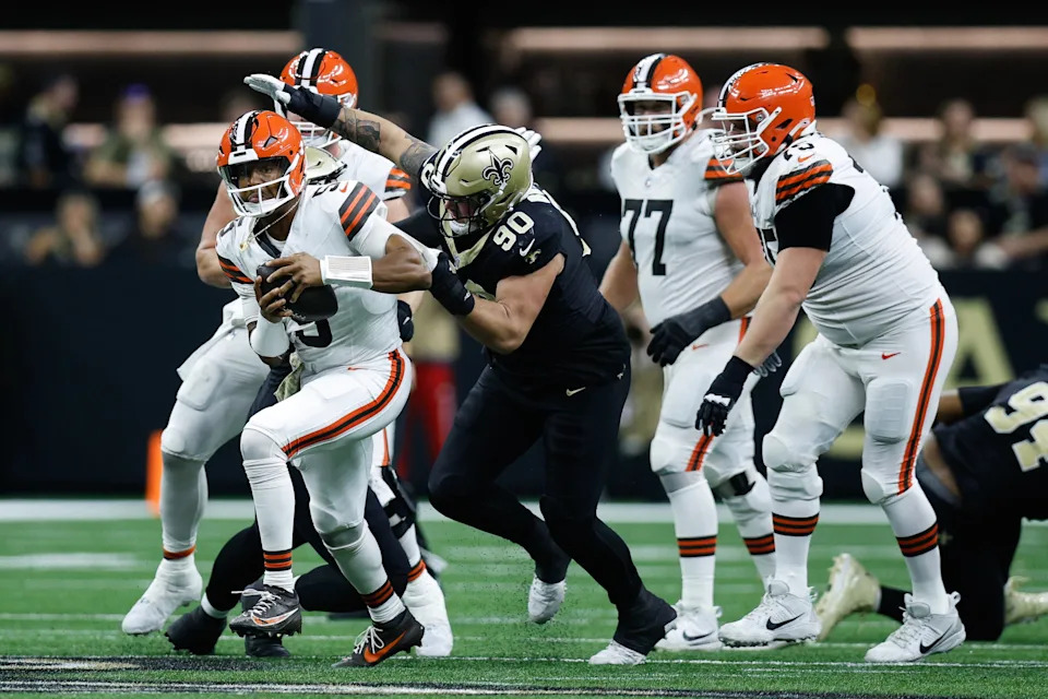 NEW ORLEANS, LOUISIANA – NOVEMBER 17: Jameis Winston #5 of the Cleveland Browns scrambles away from Bryan Bresee #90 of the New Orleans Saints during the fourth quarter at Caesars Superdome on November 17, 2024 in New Orleans, Louisiana. (Photo by Sean Gardner/Getty Images)