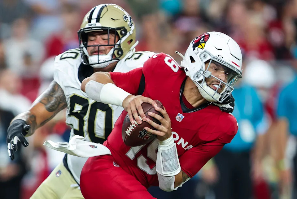GLENDALE, ARIZONA – AUGUST 10: Bryan Bresee #90 of the New Orleans Saints gets a hand on Desmond Ridder #19 of the Arizona Cardinals during the first quarter of a preseason football game at State Farm Stadium on August 10, 2024 in Glendale, Arizona. (Photo by Mike Christy/Getty Images)