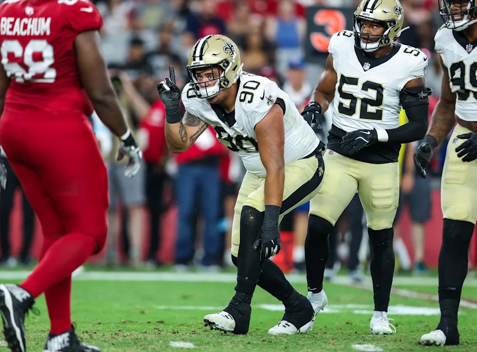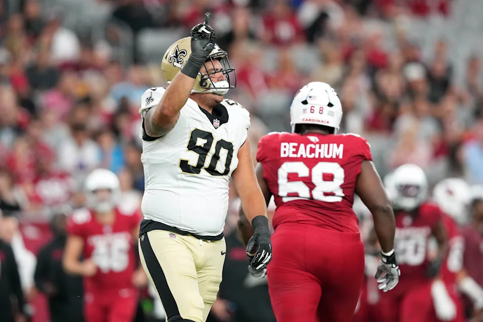 GLENDALE, ARIZONA – AUGUST 10: Bryan Bresee #90 of the New Orleans Saints celebrates a defensive stop during the first quarter of a preseason football game against the Arizona Cardinals at State Farm Stadium on August 10, 2024 in Glendale, Arizona. (Photo by Mike Christy/Getty Images)
