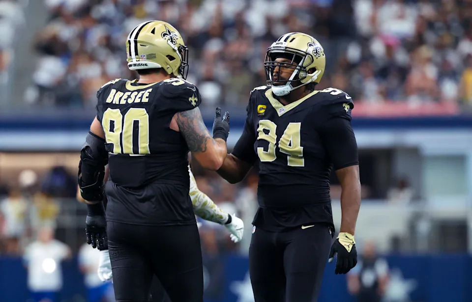 Sep 15, 2024; Arlington, Texas, USA; New Orleans Saints defensive end Cameron Jordan (94) celebrates with New Orleans Saints defensive tackle Bryan Bresee (90) during the second half against the Dallas Cowboys at AT&T Stadium. Mandatory Credit: Kevin Jairaj-Imagn Images