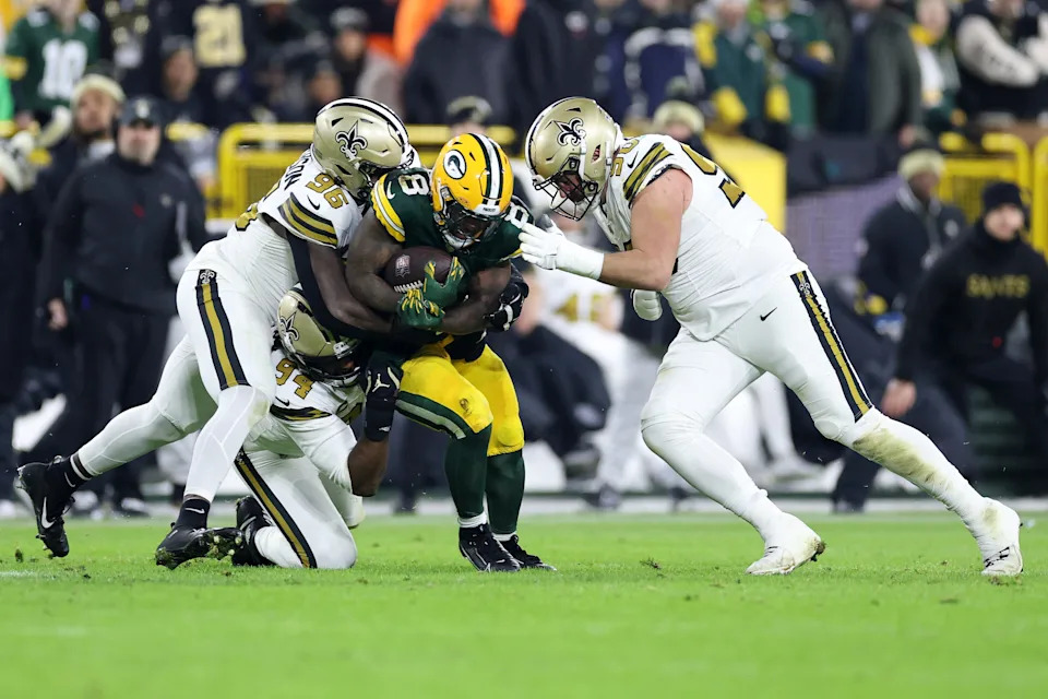 GREEN BAY, WISCONSIN – DECEMBER 23: Josh Jacobs #8 of the Green Bay Packers is brought down by Cameron Jordan #94, Carl Granderson #96 and Bryan Bresee #90 of the New Orleans Saints during a game at Lambeau Field on December 23, 2024 in Green Bay, Wisconsin. The Packers defeated the Saints 34-0. (Photo by Stacy Revere/Getty Images)