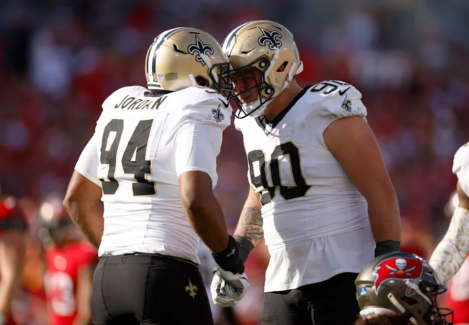 TAMPA, FLORIDA – JANUARY 05: Bryan Bresee #90 and Cameron Jordan #94 of the New Orleans Saints celebrate a defensive play against the Tampa Bay Buccaneers in the fourth quarter game against the Tampa Bay Buccaneers at Raymond James Stadium on January 05, 2025 in Tampa, Florida. (Photo by Mike Ehrmann/Getty Images)