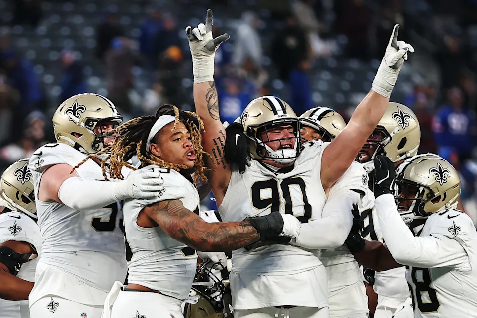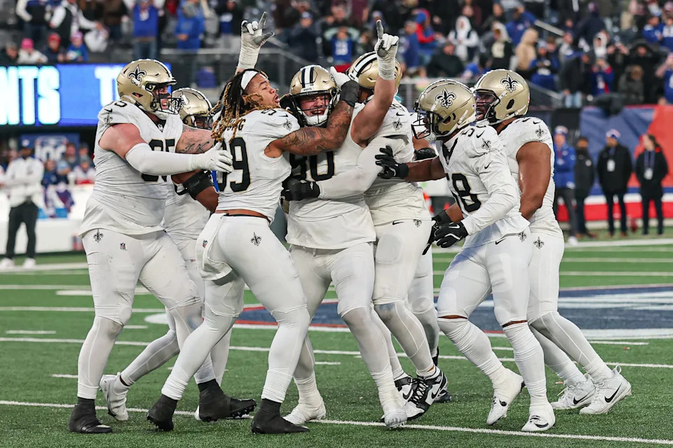EAST RUTHERFORD, NEW JERSEY – DECEMBER 08: Bryan Bresee #90 of New Orleans Saints celebrates with teammates after blocking a field goal attempt against the New York Giants in the fourth quarter at MetLife Stadium on December 08, 2024 in East Rutherford, New Jersey. (Photo by Sarah Stier/Getty Images)