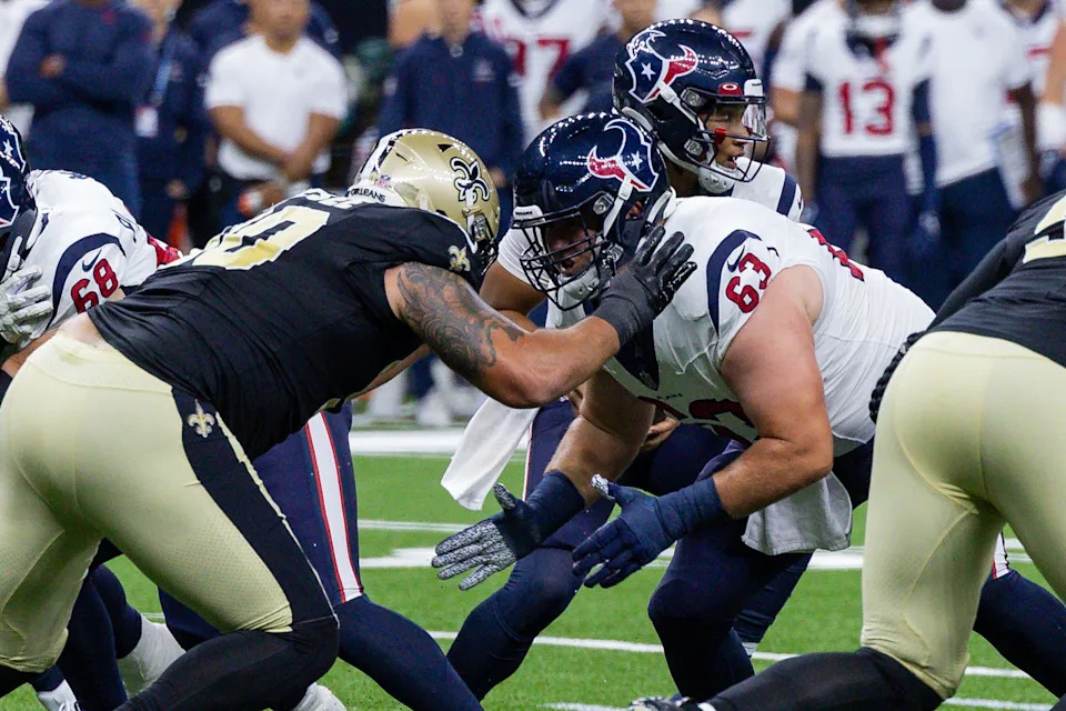 Aug 27, 2023; New Orleans, Louisiana, USA; Houston Texans center Michael Deiter (63) blocks New Orleans Saints defensive tackle Bryan Bresee (90) during the first half at the Caesars Superdome. Mandatory Credit: Stephen Lew-USA TODAY Sports