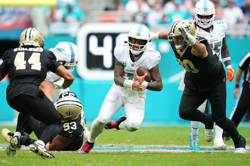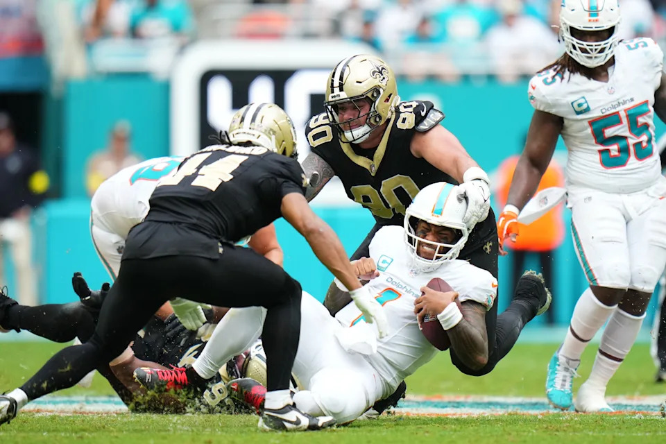 Nov 30, 2025; Miami Gardens, Florida, USA; Miami Dolphins quarterback Tua Tagovailoa (1) gets tackled by New Orleans Saints defensive tackle Bryan Bresee (90) during the second half at Hard Rock Stadium. Mandatory Credit: Rich Storry-Imagn Images