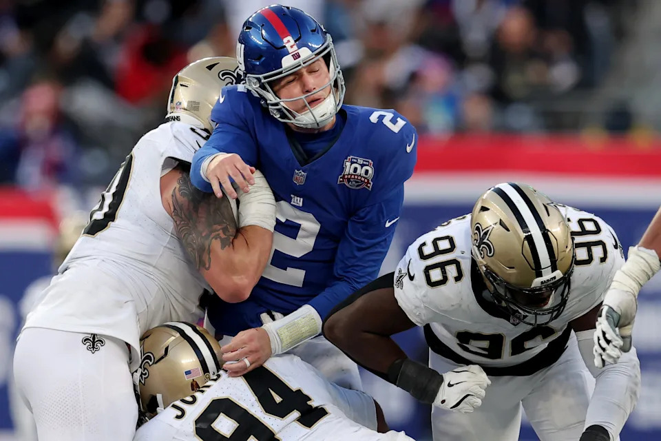 Dec 8, 2024; East Rutherford, New Jersey, USA; New York Giants quarterback Drew Lock (2) is hit after throwing a pass by New Orleans Saints defensive tackle Bryan Bresee (90) and defensive ends Cameron Jordan (94) and Carl Granderson (96) during the fourth quarter at MetLife Stadium. Mandatory Credit: Brad Penner-Imagn Images