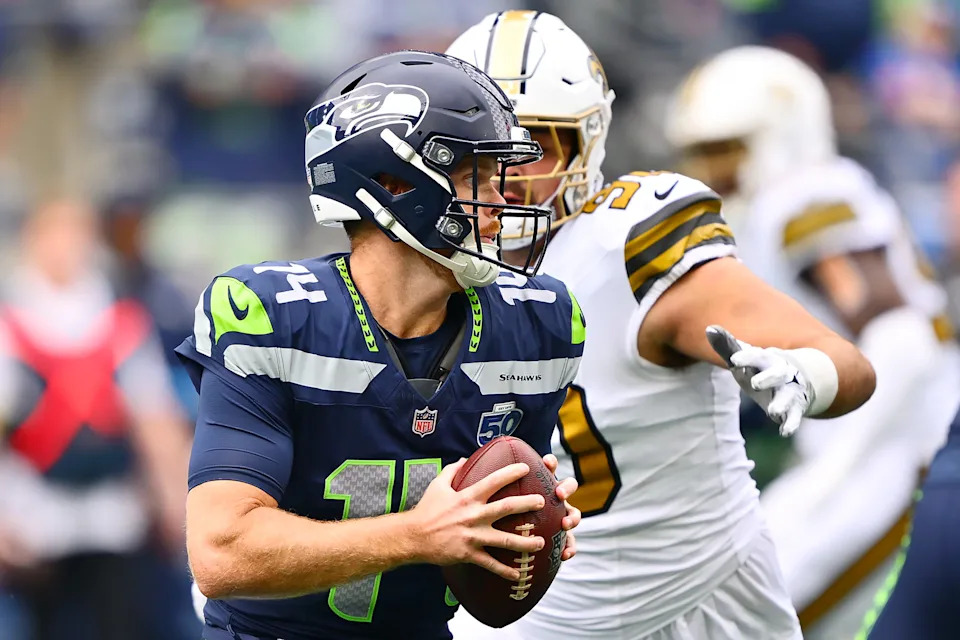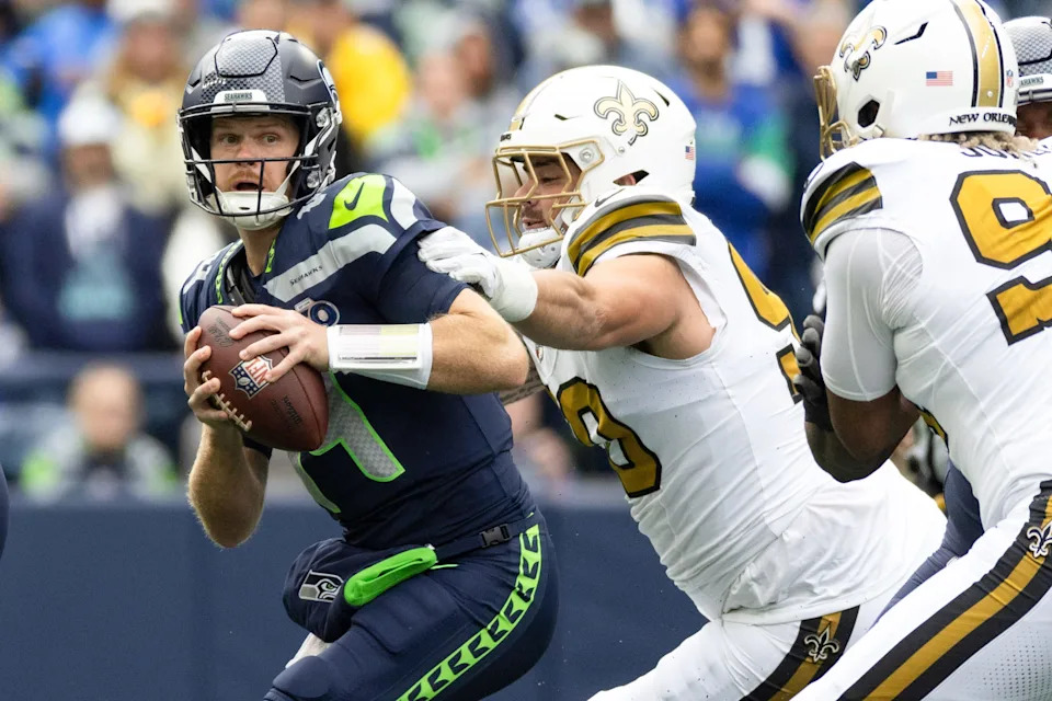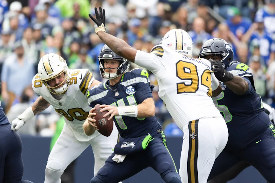 SEATTLE, WASHINGTON – SEPTEMBER 21: Sam Darnold #14 of the Seattle Seahawks looks to pass the ball under pressure from Bryan Bresee #90 of the New Orleans Saints during the first quarter at Lumen Field on September 21, 2025 in Seattle, Washington. (Photo by Jane Gershovich/Getty Images)