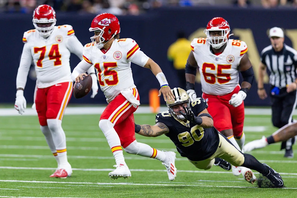 Aug 13, 2023; New Orleans, Louisiana, USA; New Orleans Saints defensive tackle Bryan Bresee (90) misses the tackle on Kansas City Chiefs quarterback Patrick Mahomes (15) during the first half at the Caesars Superdome. Mandatory Credit: Stephen Lew-USA TODAY Sports