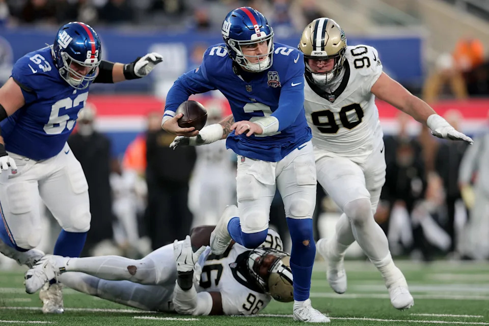Dec 8, 2024; East Rutherford, New Jersey, USA; New York Giants quarterback Drew Lock (2) runs with the ball against New Orleans Saints defensive end Carl Granderson (96) and defensive tackle Bryan Bresee (90) during the fourth quarter at MetLife Stadium. Mandatory Credit: Brad Penner-Imagn Images