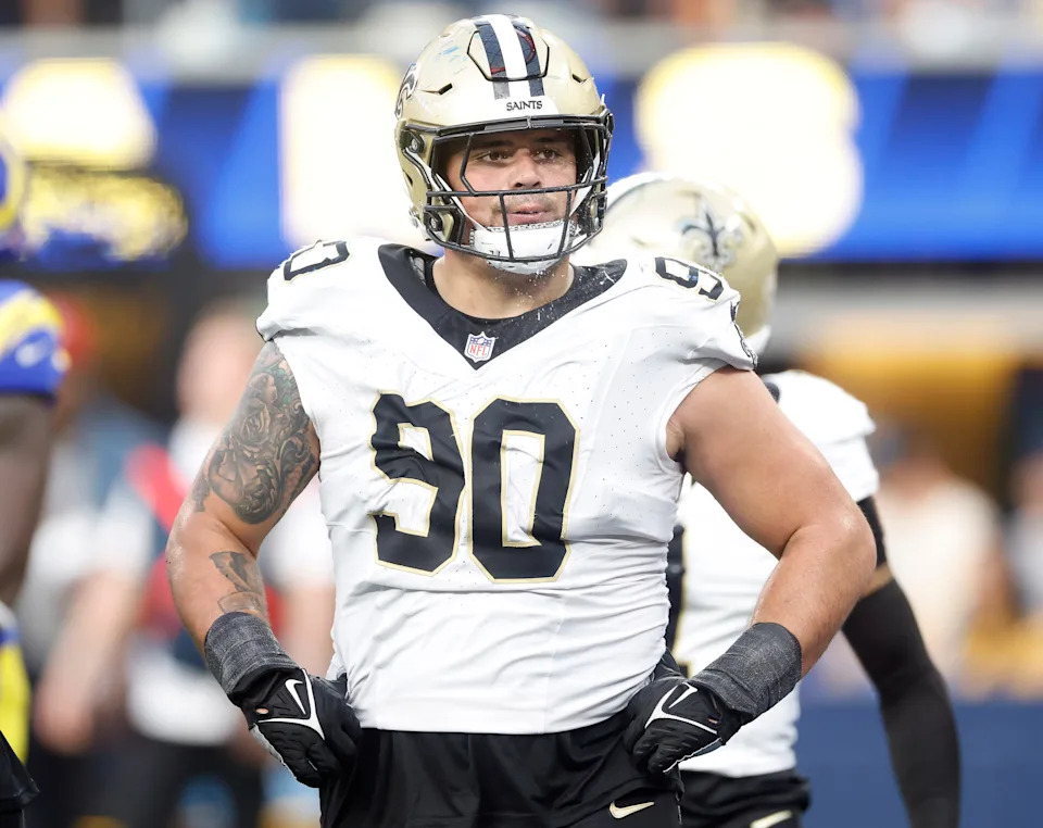 INGLEWOOD, CALIFORNIA – NOVEMBER 02: Bryan Bresee #90 of the New Orleans Saints during the NFL 2025 game between New Orleans Saints and Los Angeles Rams at SoFi Stadium on November 02, 2025 in Inglewood, California. (Photo by Ronald Martinez/Getty Images)