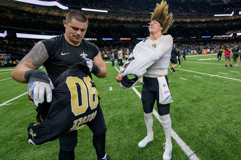 Oct 19, 2023; New Orleans, Louisiana, USA; Jacksonville Jaguars quarterback Trevor Lawrence (16) trades jerseys with New Orleans Saints defensive tackle Bryan Bresee (90) after defeating the Saints at the Caesars Superdome. Mandatory Credit: Matthew Hinton-USA TODAY Sports