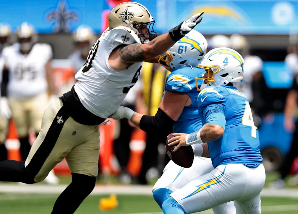 INGLEWOOD, CALIFORNIA – AUGUST 10: Taylor Heinicke #4 of the Los Angeles Chargers throws in front of Bryan Bresee #90 of the New Orleans Saints in the first half during a NFL Preseason 2025 game at SoFi Stadium on August 10, 2025 in Inglewood, California. (Photo by Ronald Martinez/Getty Images)
