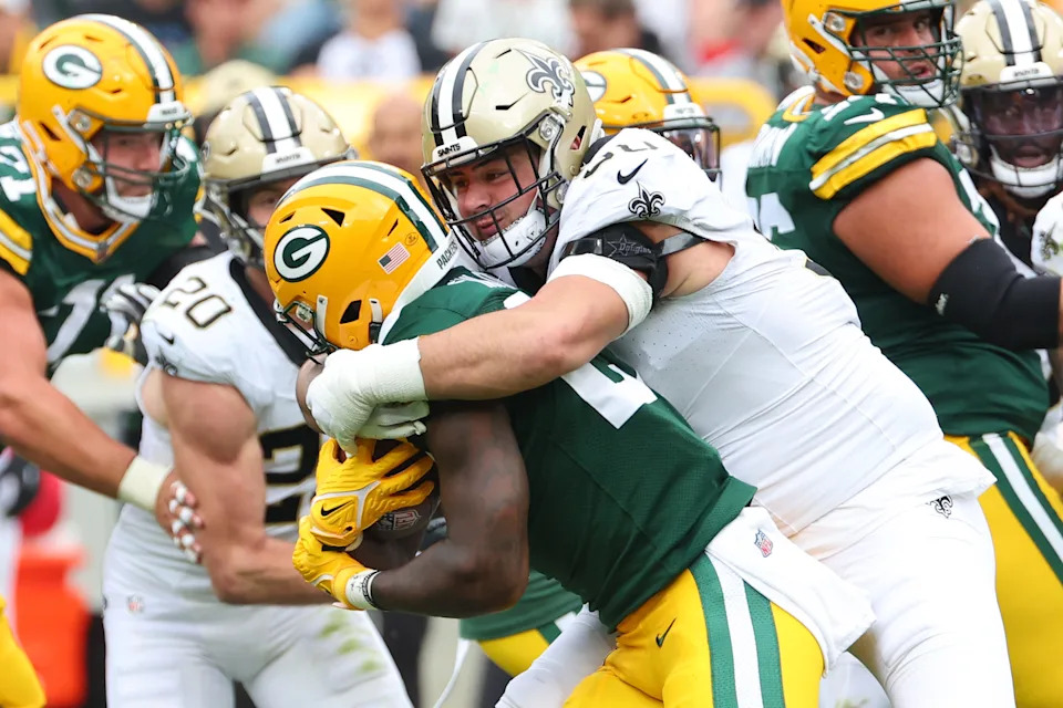 GREEN BAY, WISCONSIN – SEPTEMBER 24: Patrick Taylor #27 of the Green Bay Packers is brought down by Bryan Bresee #90 of the New Orleans Saints during a game at Lambeau Field on September 24, 2023 in Green Bay, Wisconsin. (Photo by Stacy Revere/Getty Images)