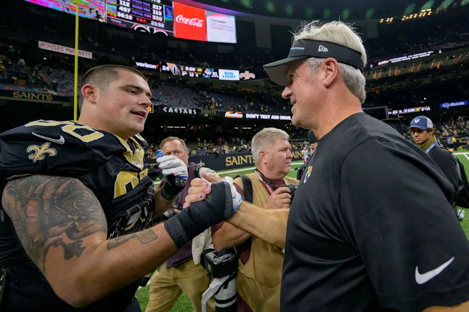 Oct 19, 2023; New Orleans, Louisiana, USA; Jacksonville Jaguars head coach Doug Pederson greets New Orleans Saints defensive tackle Bryan Bresee (90) after defeating the New Orleans Saints at the Caesars Superdome. Mandatory Credit: Matthew Hinton-USA TODAY Sports