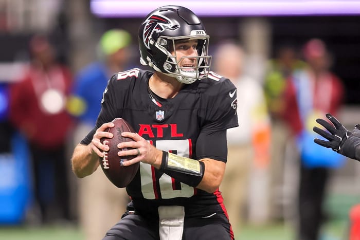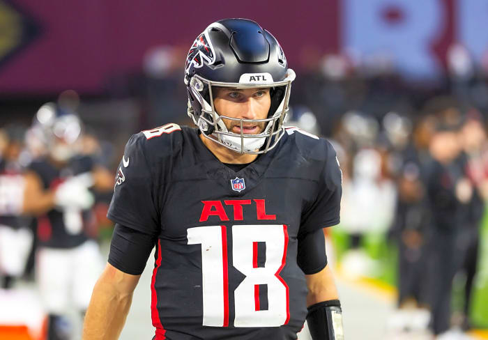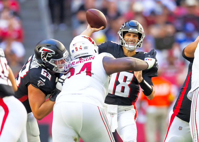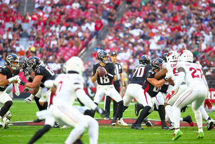 Dec 21, 2025; Glendale, Arizona, USA; Atlanta Falcons quarterback Kirk Cousins (18) against the Arizona Cardinals at State Farm Stadium. Mandatory Credit: Mark J. Rebilas-Imagn Images