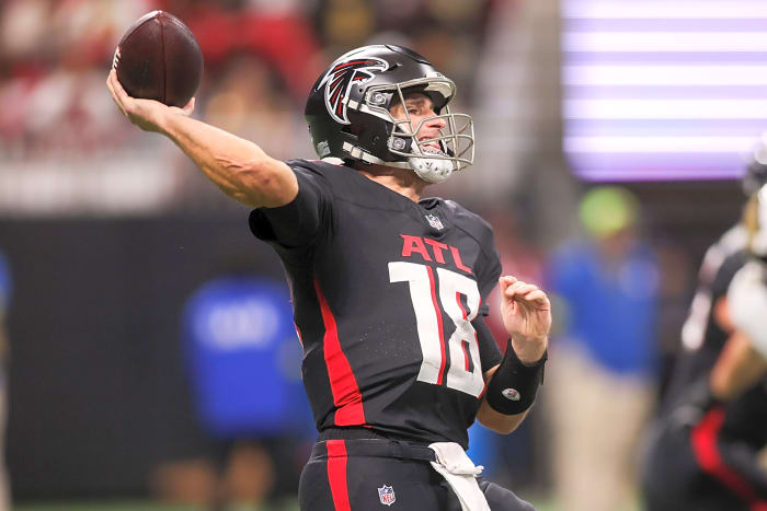 Jan 4, 2026; Atlanta, Georgia, USA; Atlanta Falcons quarterback Kirk Cousins (18) throws a pass against the New Orleans Saints in the first quarter at Mercedes-Benz Stadium. Mandatory Credit: Brett Davis-Imagn Images