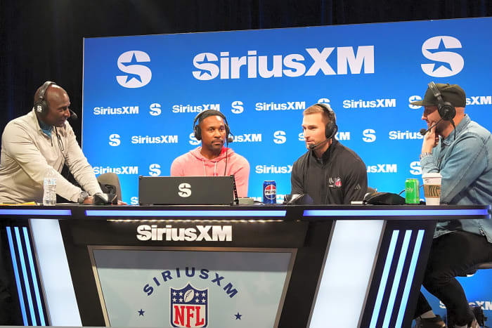 Feb 6, 2026; San Francisco, CA, USA; From left: Solomon Wilcots, Patrick Peterson, Kirk Cousins and Brian Hoyer on the Opening Drive show on the SiriusXM NFL radio set at the Super Bowl LX media center at the Moscone Center. Mandatory Credit: Kirby Lee-Imagn Images