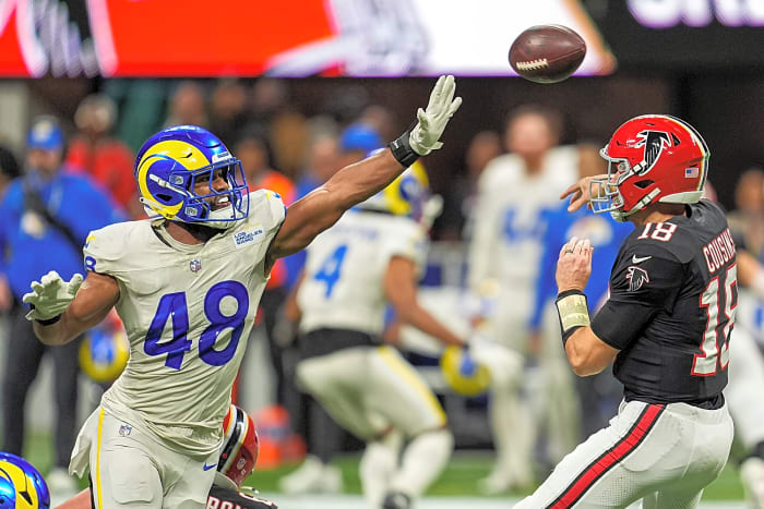 Dec 29, 2025; Atlanta, Georgia, USA; Atlanta Falcons quarterback Kirk Cousins (18) passes over Los Angeles Rams linebacker Omar Speights (48) during the second half at Mercedes-Benz Stadium. Mandatory Credit: Dale Zanine-Imagn Images