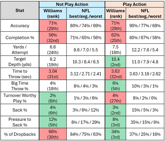 The table below shows how Williams performed in a wide variety of statistics in play action (orange) vs. other dropbacks (blue), and also includes Williams’ rank (in parentheses) out of 32 total NFL QBs who had at least 250 pass attempts. Information on the spread of all NFL QBs is also provided for each stat. Cells highlighted in green indicate Williams was among the top 25% of QBs in this category, while those in red indicate Williams was in the bottom 25% of QBs. All data comes from Pro Football Focus (PFF) unless otherwise noted.