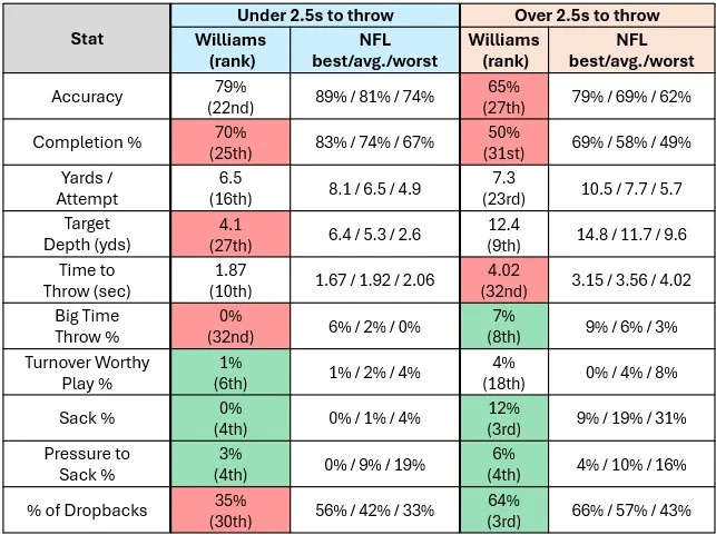 The table below shows the same stats as the play action one above. Once again, Williams’ data is shown ranked out of the 32 QB sample, information is provided about the spread of the 32 QBs, and cells for Williams’ stats in green or red represent Williams ranking in the top 25% or bottom 25%, respectively.