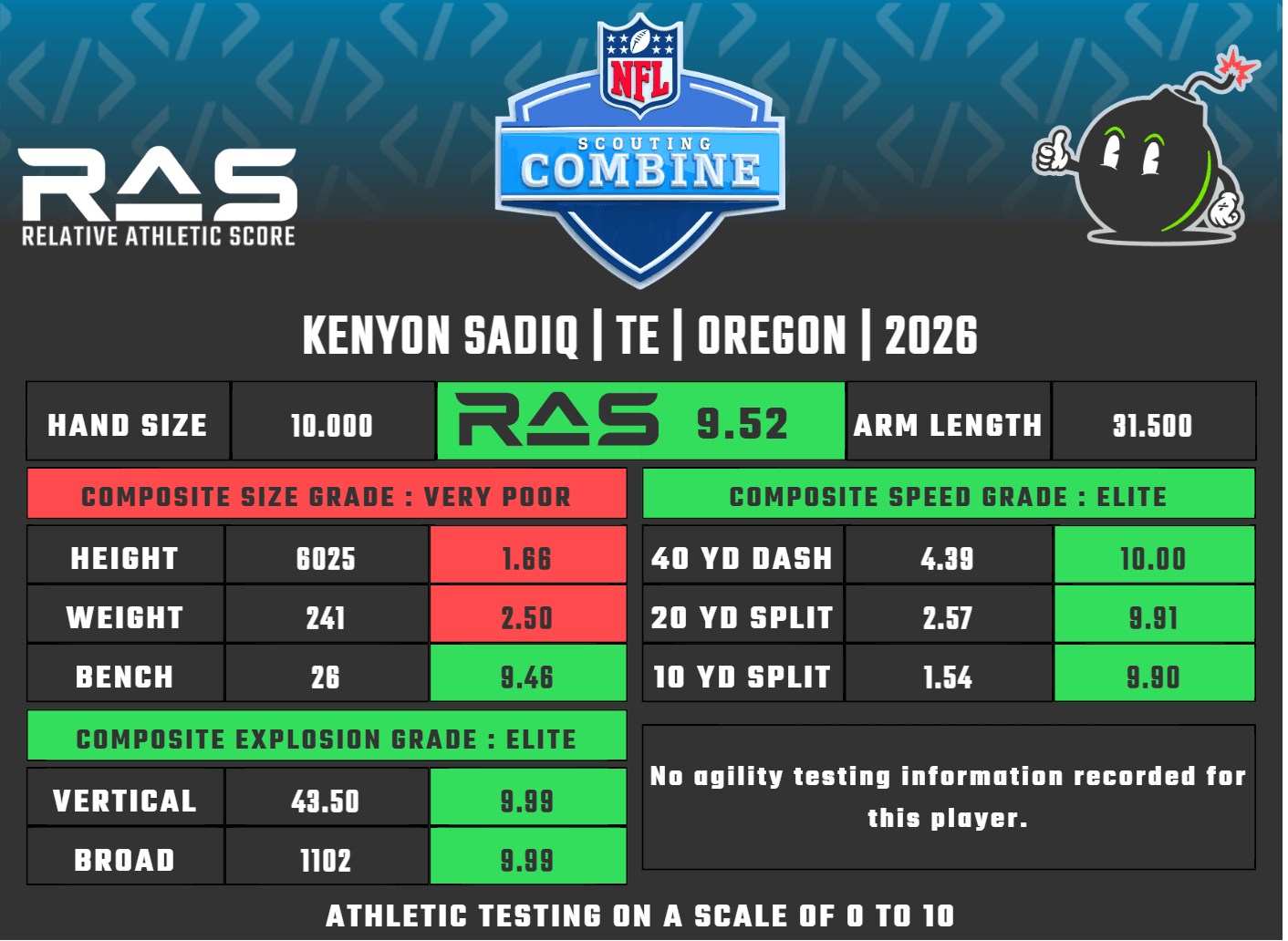 Sadiq set three TE records at the combine this year (caveats aplenty). That day, he tied David Njoku’s nine-year broad jump record of 11’1” AND Dorin Dickerson’s 2010 vertical jump record of 43.5”. While he was moments later out jumped by Eli Stowers in both categories (11’3” broad and 45.5” vertical – both new TE records), his jumping numbers are ostensibly elite. One record that Stowers did not beat… his combine 40-yard dash time of 4.39 seconds. While many sources established this as the new record over Vernon Davis’s 4.40 time, many contest that Davis actually ran it in 4.38. Either way, Sadiq is a special athlete.