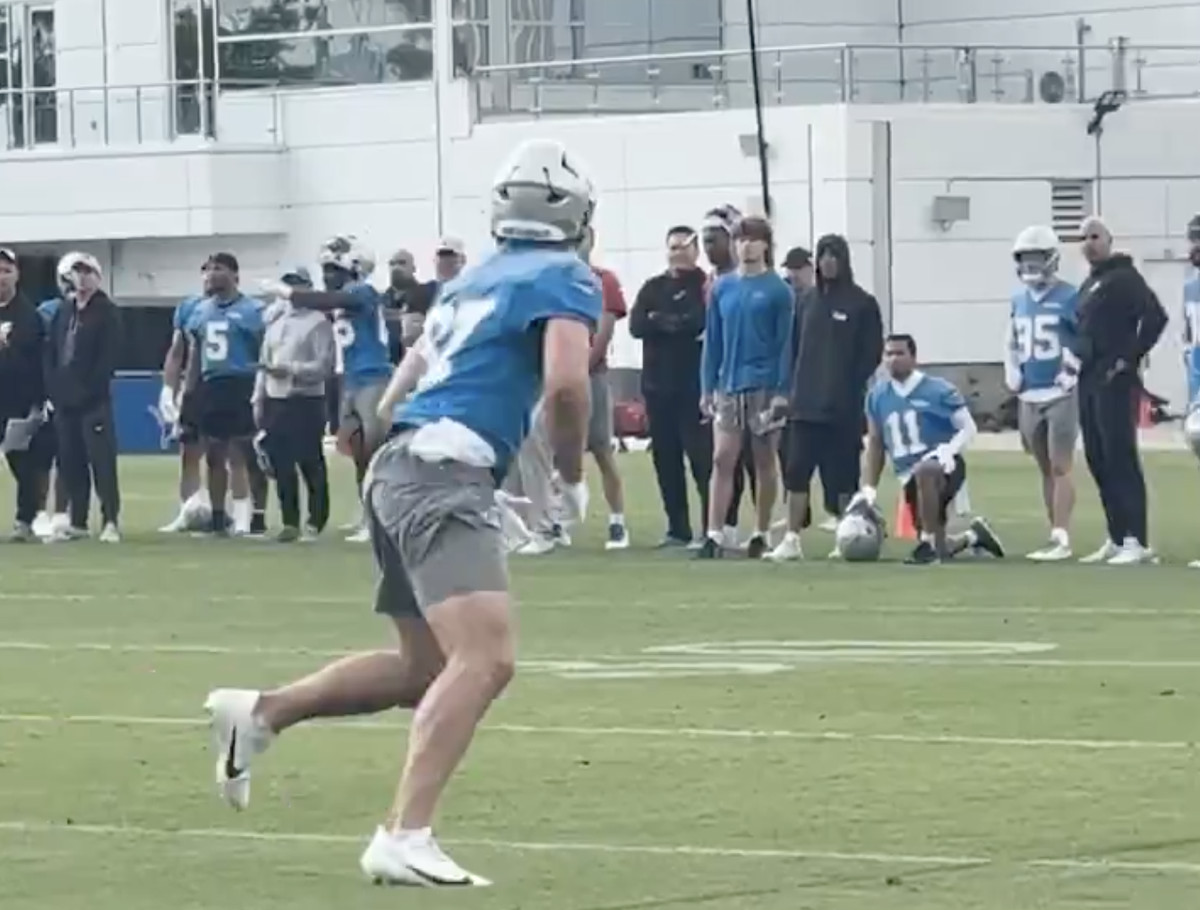 If Allen was indeed the culprit in the interception, that means he was throwing with Williams out here. Allen is later seen throwing a nice pass to Sam LaPorta for a toe-tapping reception along the sidelines. Could he be getting early reps? Both Jared Goff and Hendon Hooker were present, as evidenced by the final photo in Wednesday’s gallery. Obviously Allen isn’t in play for the starting job, but could he possibly start OTAs as QB2? Will he and Hooker split days as QB2, like the Lions have done in previous years? It’s tfoo early to jump to conclusions, but it’s certainly something to keep an eye on.