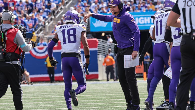 Sep 8, 2024; East Rutherford, New Jersey, USA; Minnesota Vikings wide receiver Justin Jefferson (18) celebrates head coach Kevin O’Connell after his touchdown reception during the first half against the New York Giants at MetLife Stadium. Mandatory Credit: Vincent Carchietta-Imagn Images