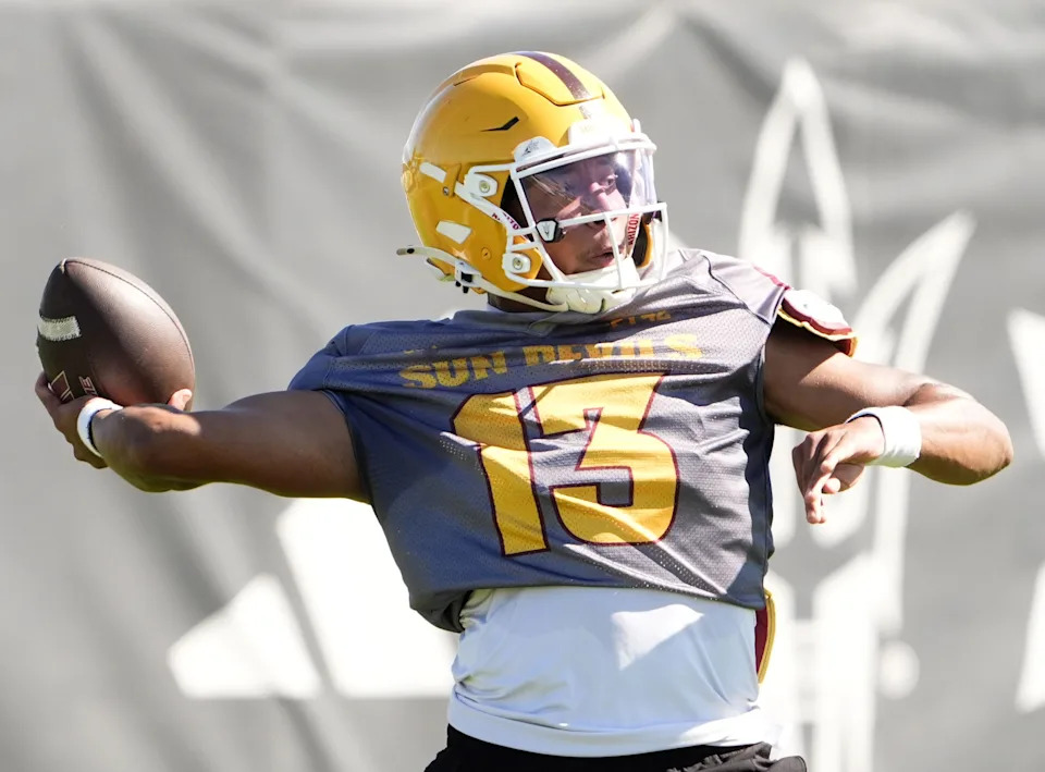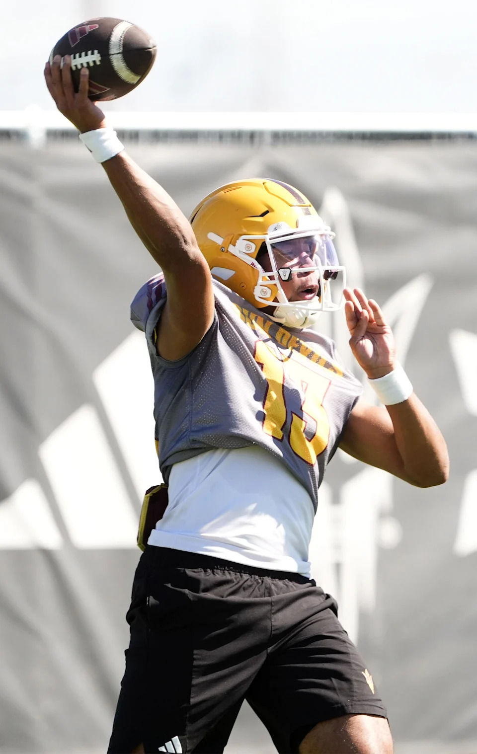Arizona State quarterback Cameron Dyer (13) during practice on March 24, 2026, at Kajikawa Practice Fields in Tempe.