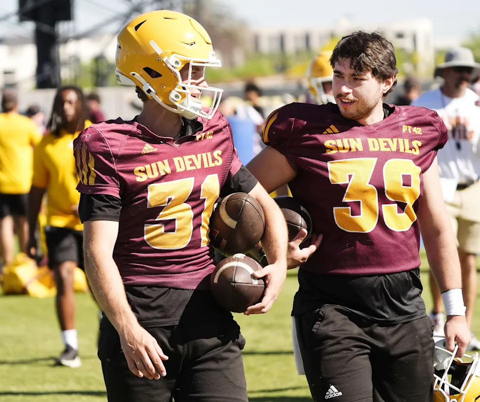 Arizona State punter Kanyon Floyd (31) and long snapper Tyler Wigglesworth (39) during practice on March 24, 2026, at Kajikawa Practice Fields in Tempe.