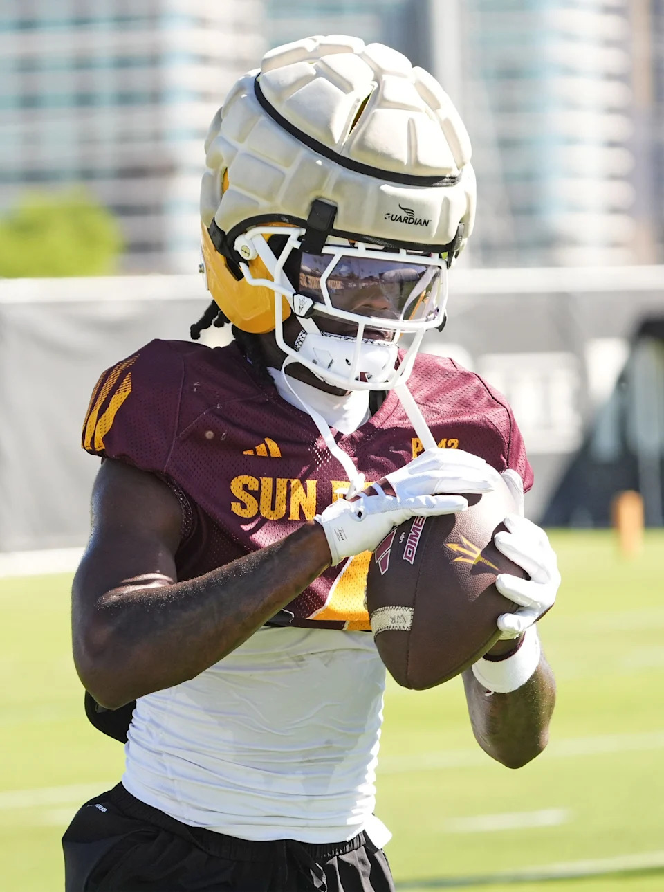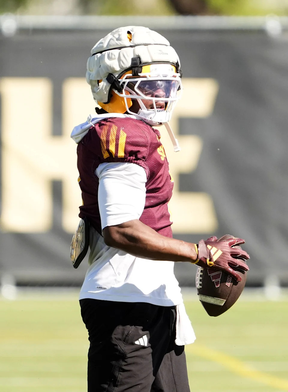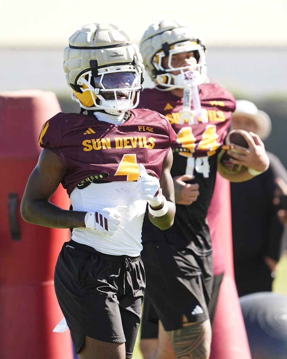 Arizona State wide receiver Omarion Miller (4) during practice on March 24, 2026, at Kajikawa Practice Fields in Tempe.