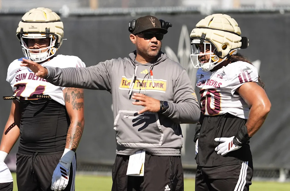 Arizona State linebackers coach A.J. Cooper talks to linebacker Zyrus Fiaseu (30) during practice on March 24, 2026, at Kajikawa Practice Fields in Tempe.