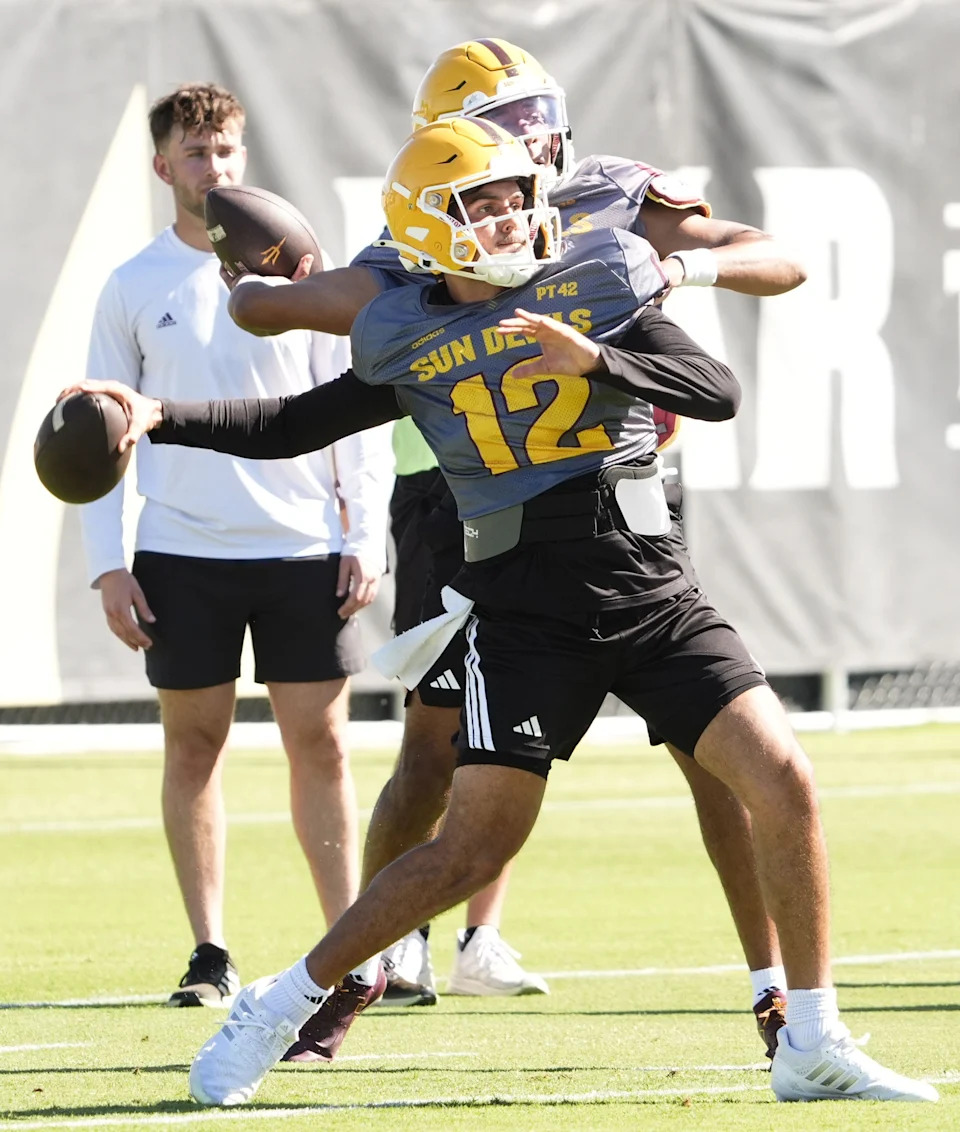 Arizona State quarterback Mikey Keene (12) during practice on March 24, 2026, at Kajikawa Practice Fields in Tempe.