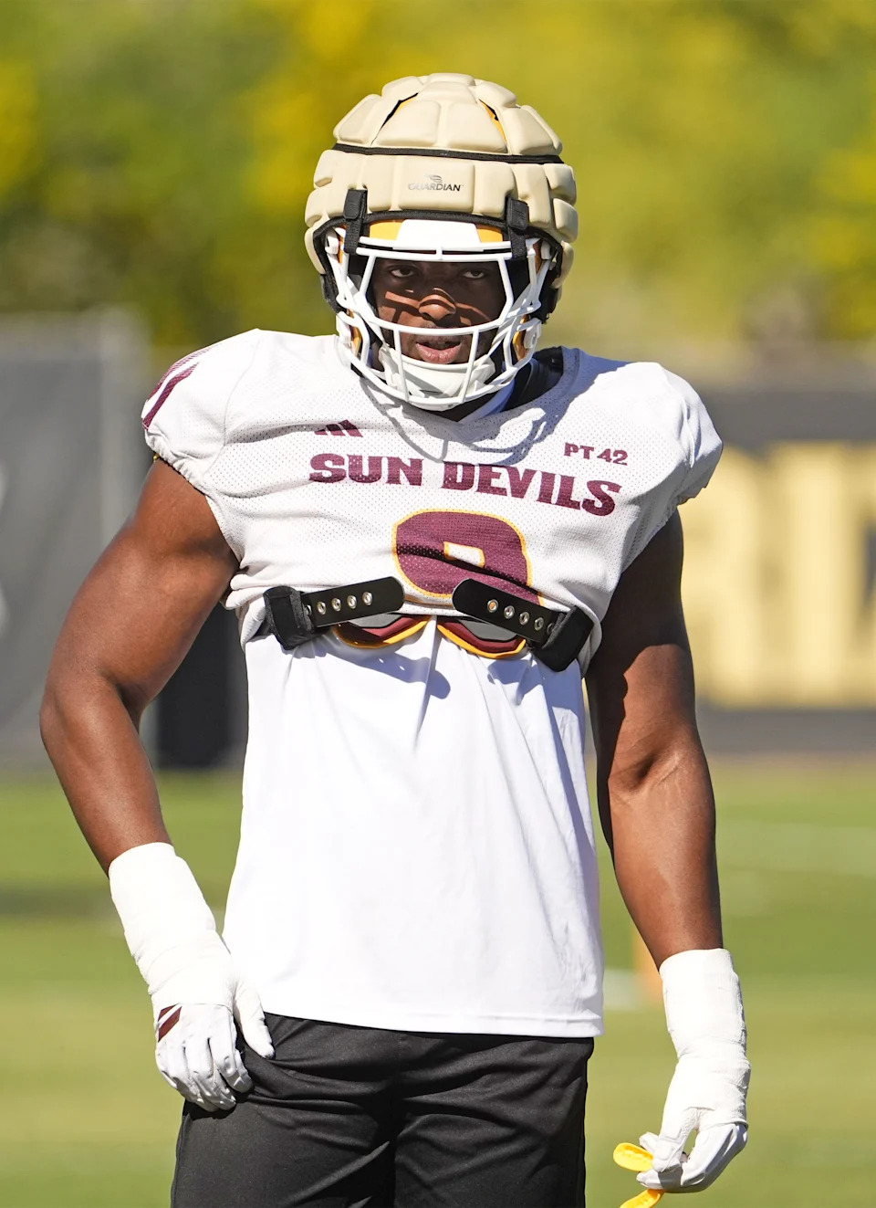 Arizona State defensive lineman Jalen Thompson (9) during practice on March 24, 2026, at Kajikawa Practice Fields in Tempe.