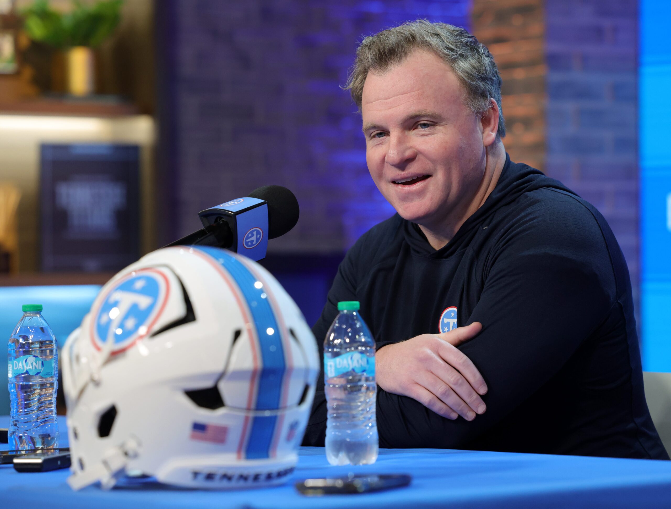 Titans general manager Mike Borgonzi speaks to members of the media during a pre NFL draft press conference held at the Titans practice facility Thursday, April 16, 2026.