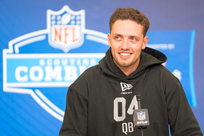 Feb 27, 2026; Indianapolis, IN, USA; Miami quarterback Carson Beck (QB04) speaks to members of the media during the NFL Combine at the Indiana Convention Center. Mandatory Credit: Jacob Musselman-Imagn Images