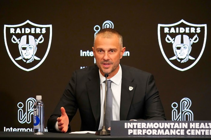 Jan 27, 2025; Las Vegas, NV, USA; Las Vegas Raiders general manager John Spytek speaks at a press conference at Intermountain Health Performance Center. Mandatory Credit: Kirby Lee-Imagn Images